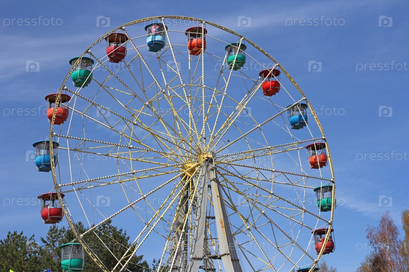 Красочное колесо обозрения на фоне голубого неба