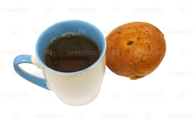 Чашка кофе с булочкой на белом фоне