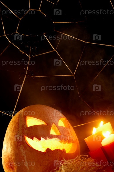 Светящаяся тыква на соломе и три свечи на черном фоне с паутиной