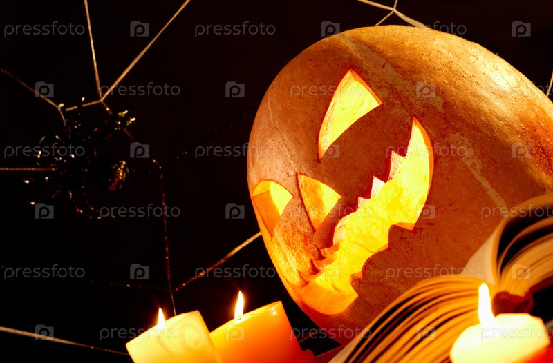 Справа светящаяся тыква со свечами, книгой и пауком на паутине