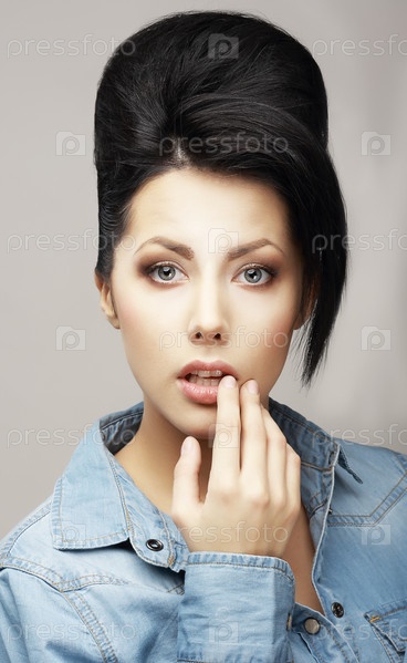 Индивидуальность. Очаровательная стильная задумчивая брюнетка. Модная прическа с чубом