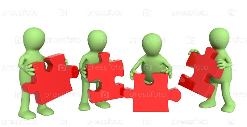 Взаимодействие. Зеленые человечки с кусочками красных пазлов