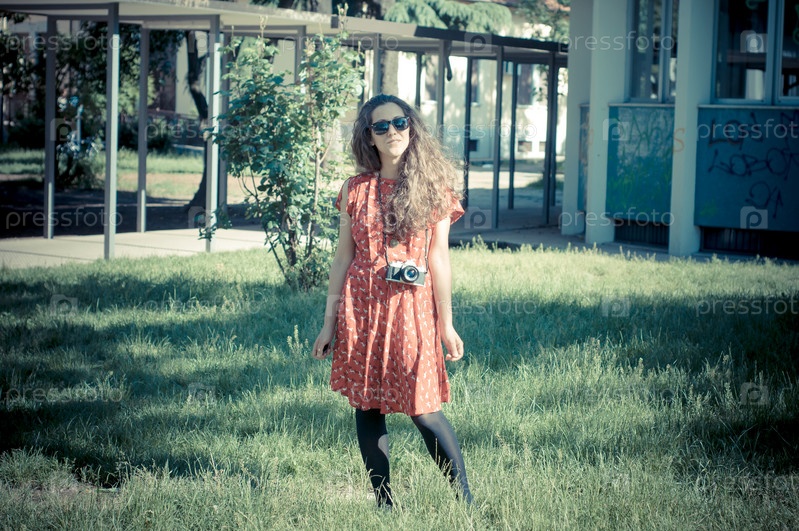 Женщина в винтажной одежде со старой камерой