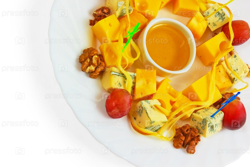 Сыр, виноград и орехи на белом фоне