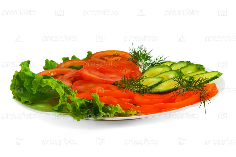 Нарезанные огурцы, помидоры и салат на белом фоне
