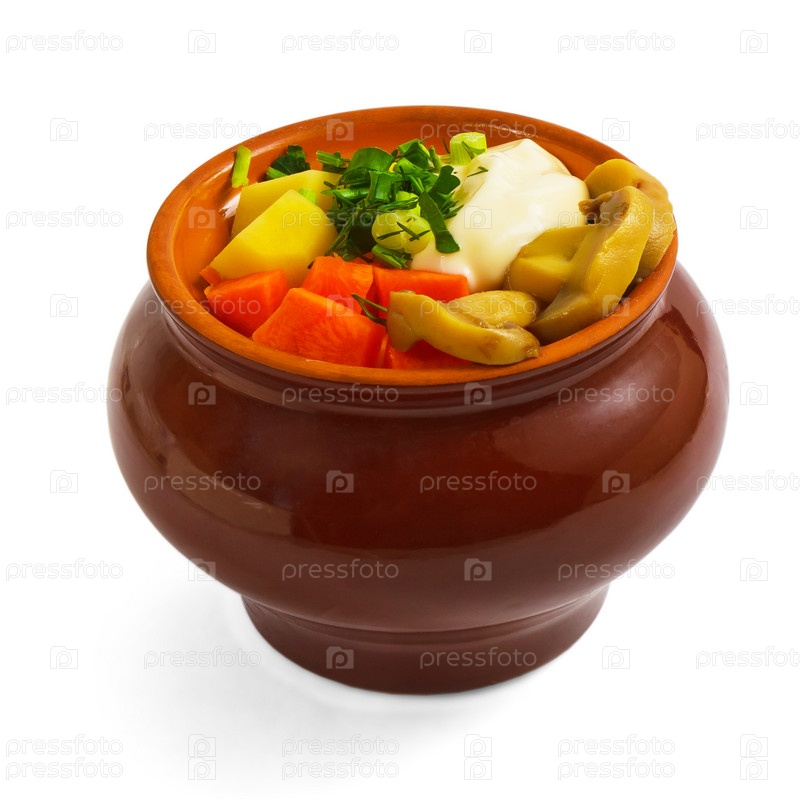 Горшочек с картофелем и грибами на белом фоне