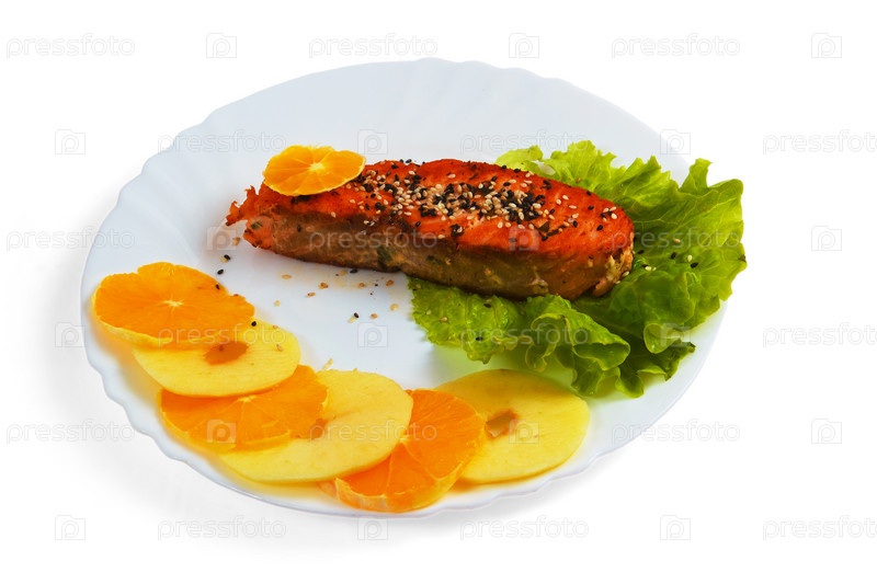 Рыба с салатом на белом фоне