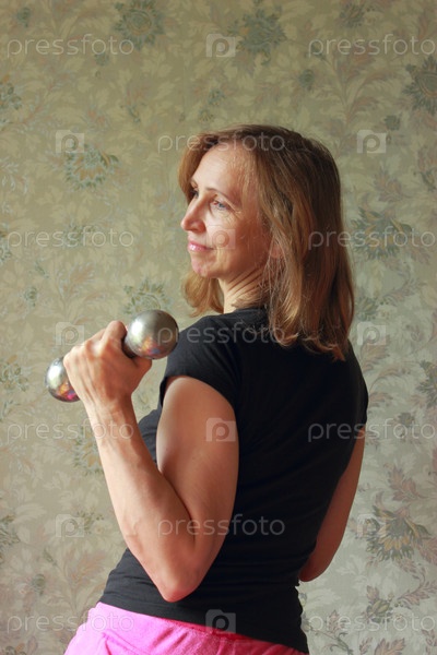 Женщина с гантелями занимается зарядкой