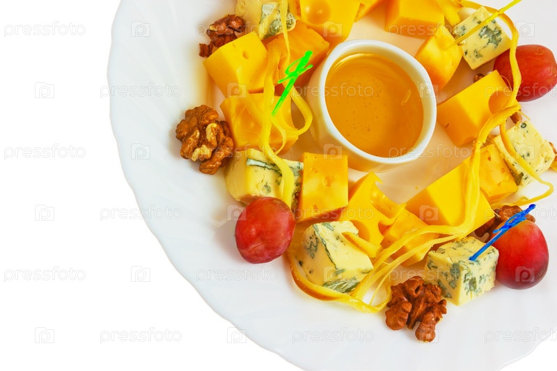 Сыр, виноград и орехи на белом фоне