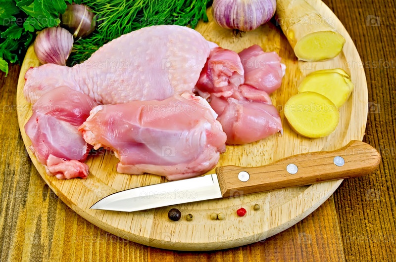 Куриная ножка, разрезанная на круглой доске, с ножом