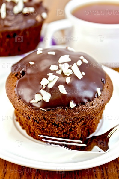 Шоколадный кекс на белой тарелке с вилкой