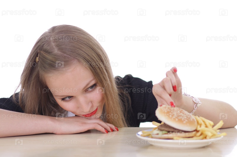 Женщина с гамбургером на тарелке