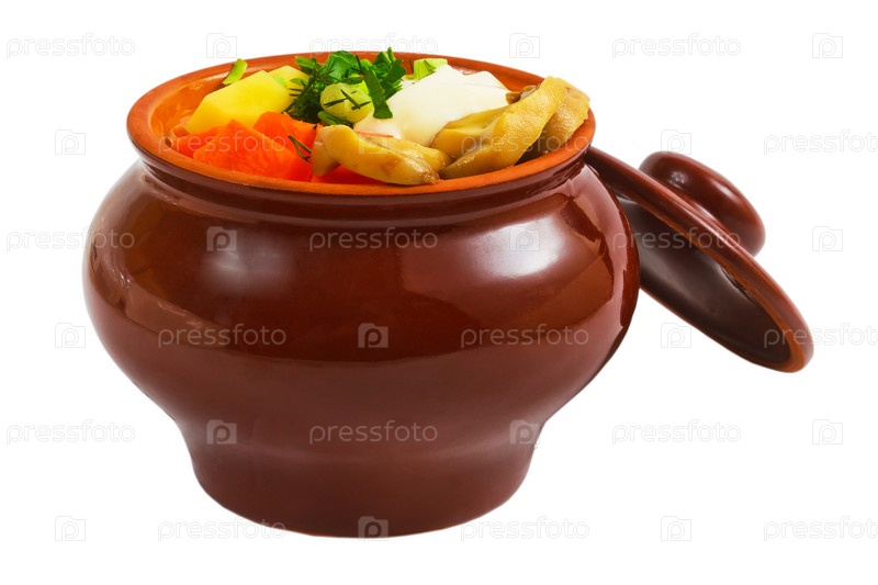 Картофель, грибы, морковь в горшке, изолированные на белом фоне