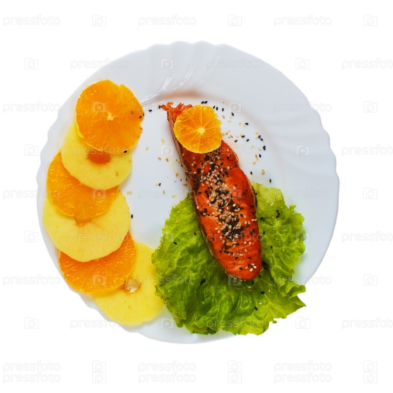 Вкусная отварная рыба с салатом, изолированная на белом фоне с путем отсечения
