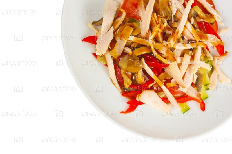 Мясо, грибы, помидор, огурец, изолированные на белом фоне