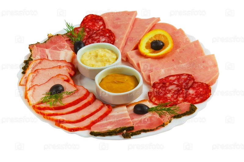 Нарезанная колбаса и ветчина с горчицей, изолированные на белом фоне с путем отсечения