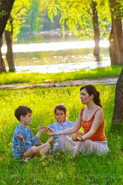 Мама, дочь и сын медитируют на пикнике