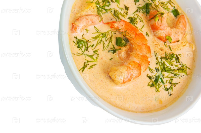 Суп из креветок, изолированный на белом фоне с обтравочным контуром