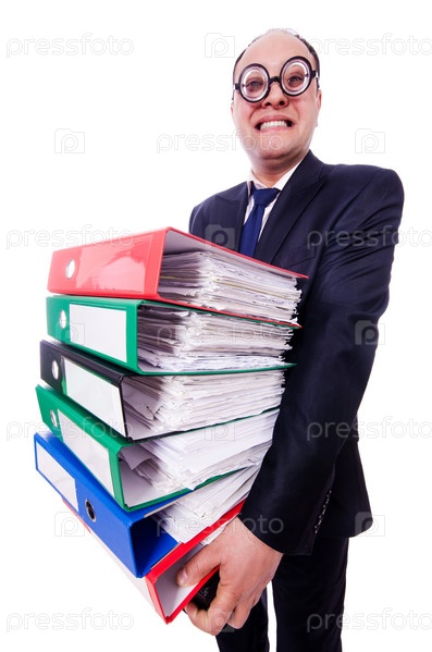 Забавный человек с большим количеством папок на белом фоне