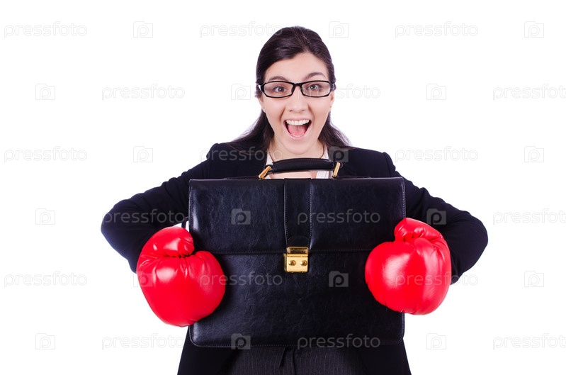 Бизнес-леди в боксерских перчатках на белом фоне