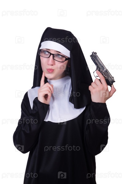 Монахиня с пистолетом, изолированная на белом