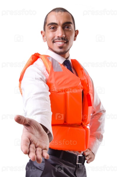 Человек в спасательном жилете, изолирован на белом фоне