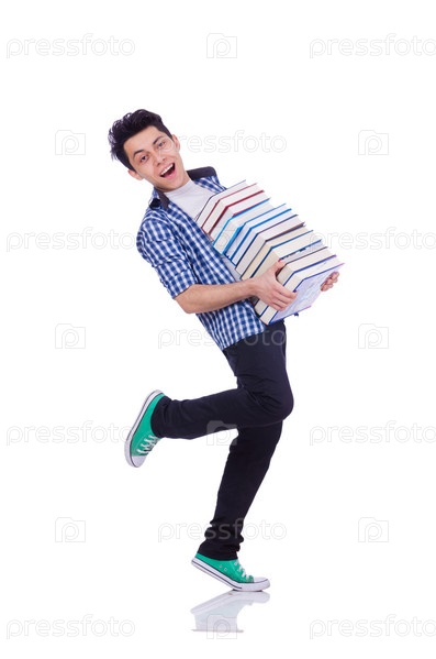 Студент с большой стопкой книг на белом фоне