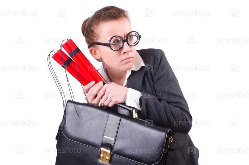 Бизнес-леди с динамитом на белом фоне