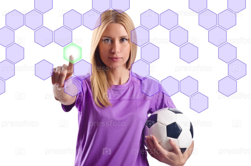 Женщина с футбольным мячом нажимает виртуальные кнопки