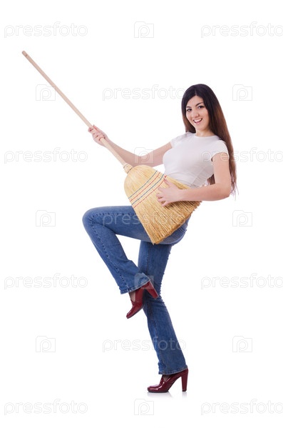 Молодая женщина с веником, изолированная на белом
