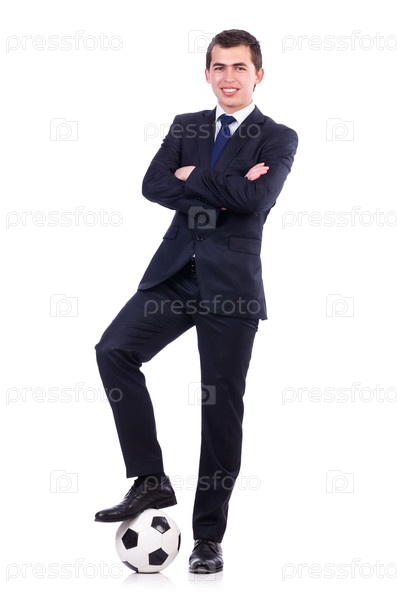 Бизнесмен с футбольным мячом, изолирован на белом фоне