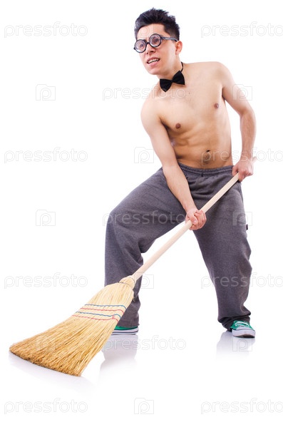 Забавный человек с веником на белом фоне