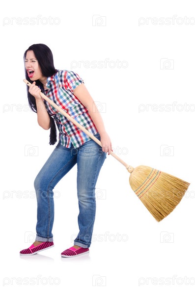 Молодая женщина с веником, изолированная на белом фоне