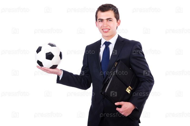 Бизнесмен с футбольным мячом, изолирован на белом фоне