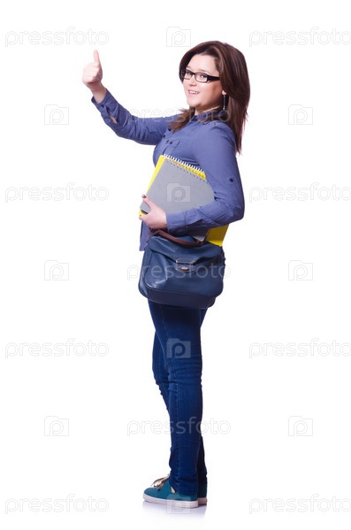Студентка с книгами на белом фоне