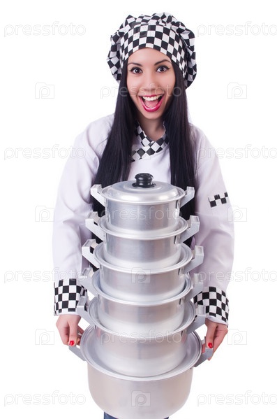Повар со стопкой кастрюль на белом фоне