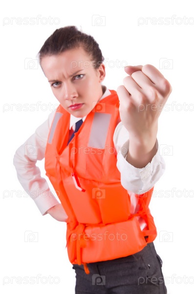 Молодая женщина в спасательном жилете на белом