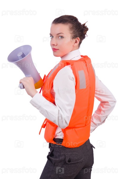 Молодая женщина в спасательном жилете с громкоговорителем на белом