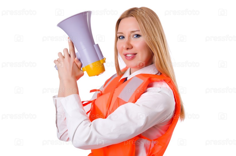 Молодая женщина с жилетом и громкоговорителем на белом фоне