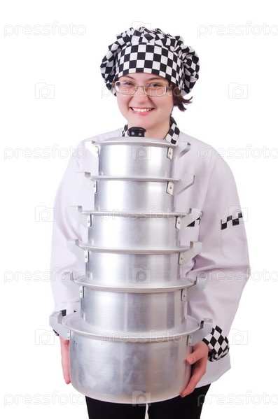 Повар со стопкой кастюль на белом фоне