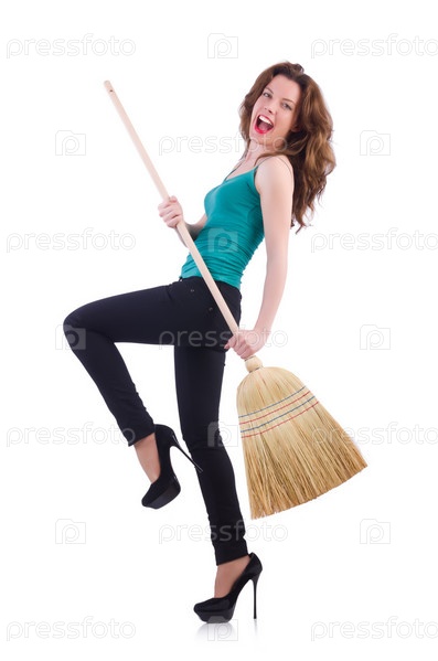 Молодая женщина с веником, изолированная на белом фоне