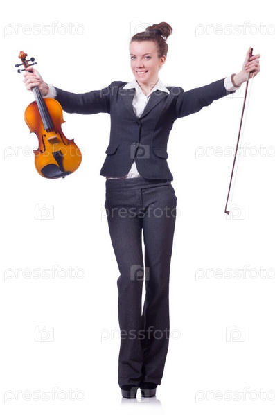 Бизнес-леди со скрипкой, изолирована на белом фоне