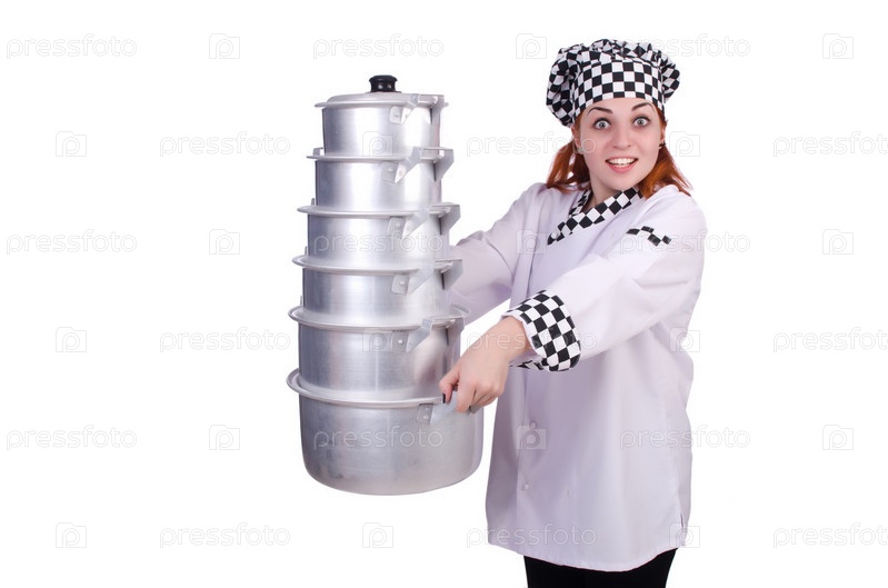 Повар со стопкой кастрюль на белом фоне