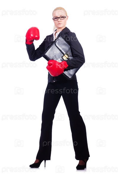 Бизнес-леди с боксерскими перчатками на белом фоне