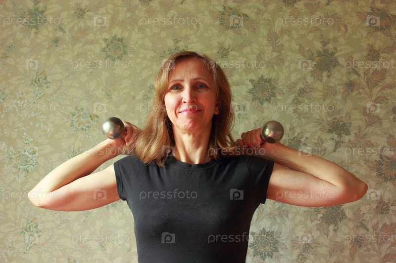 Женщина с гантелями занимается зарядкой