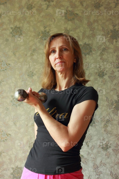 Женщина с гантелями занимается зарядкой
