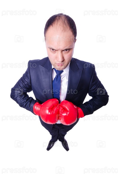 Молодой бизнесмен боксер, изолированный на белом