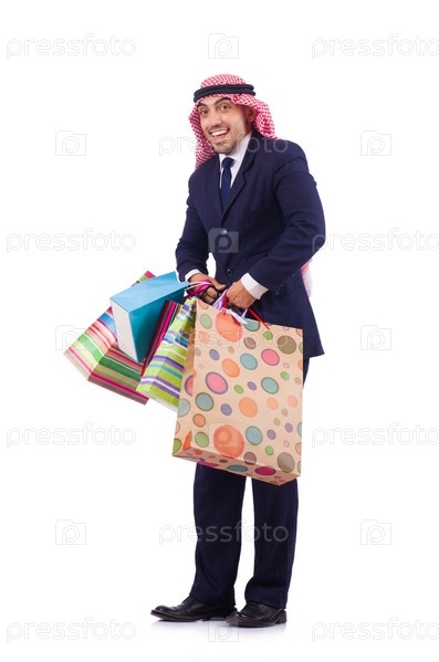Араб с покупками на белом фоне
