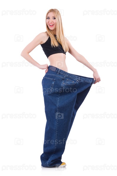 Женщина в больших джинсах в концепции диеты