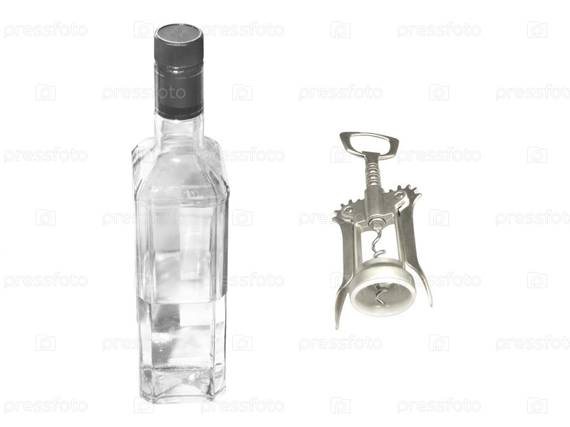 Бутылка водки и штопор на белом фоне